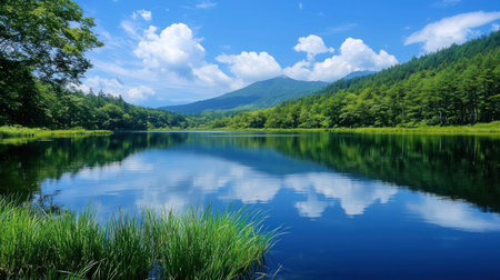A picturesque view of a calm lake reflecting the sky and surrounding greenery, creating a peaceful and natural scene.