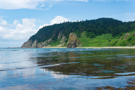 coastal landscape, rocky green coast of Kunashir island, sandy beach with algae on the littoral at low tide in the foreground