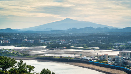 Jeju island, South Korea - Jun. 04, 2023: Beautiful seongsan port at Jeju do (Jeju island), view from top of Seongsan Ilchulbong, sunrise peak.