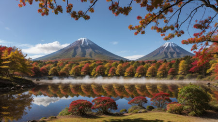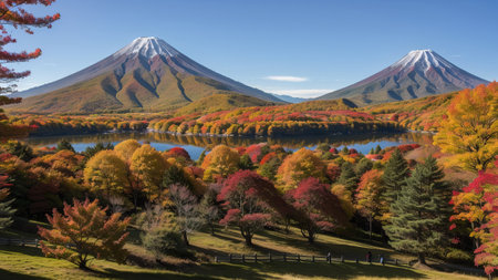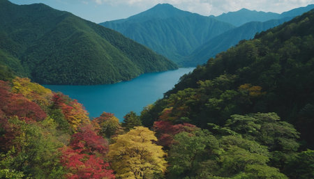 Beautiful autumn landscape with mountain lake and colorful forest in Japan.