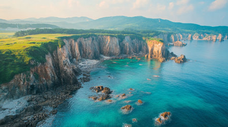 Beautiful landscape of the sea, mountains and trees in the background. Cape Giant. Bizarre rocks. Okhotsk Sea coast. Sakhalin, Russia