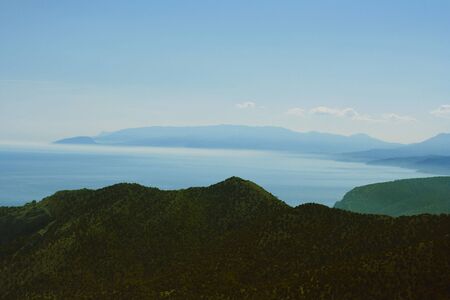Russky island aerial panoramic view. Russky Island is an island off Vladivostok in Primorsky Krai, Russia in the Peter the Great Gulf, Sea of Japan.