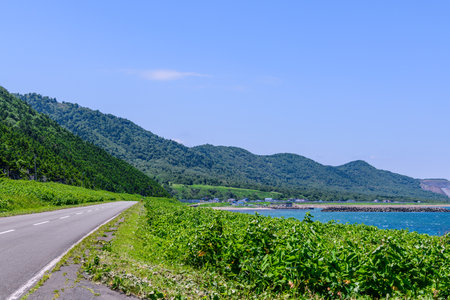 A coastal landscape of Cape Soya and Soya Port in northern Hokkaido, Japan, under the clear blue sky of June. The calm sea, distant hills, and fresh summer air capture the serene atmosphere.