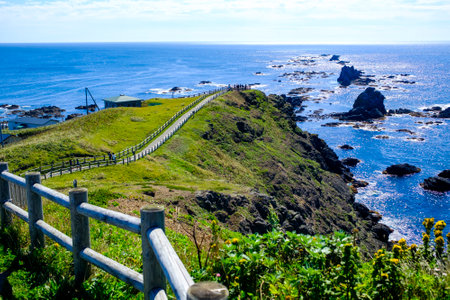 A tranquil summer view of Cape Kamui in Kitami, Hokkaido, Japan. The scene is filled with deep blue skies and vast ocean under brilliant sunlight, capturing the peaceful atmosphere