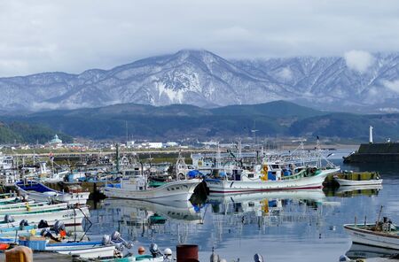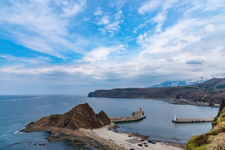 View of Utoro fishing port in springtime with Shiretoko mountain range at Utoronishi. Town Shari, Shiretoko Peninsula. Hokkaido, Japan