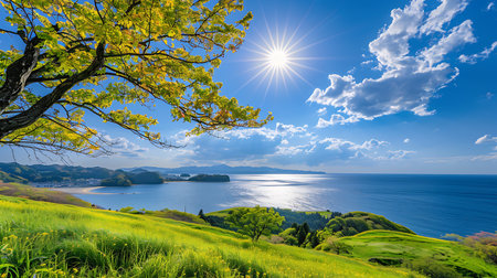 Beautiful blue sky and green and natural scenery of the sea in Kitanagato Coast Quasi-National Park