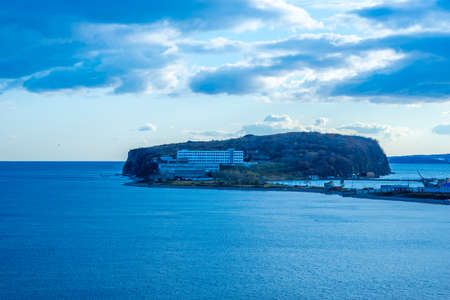 Beautiful landscape scenic of Hakodate mountain at the end of Matsukura river to ocean in Hakodate city, Hokkaido, Japan.