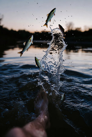 Focused fisherman in a yellow raincoat captures a fish amidst a lively water splash