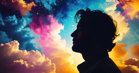 Profile of a young man with closed eyes against colorful sky with clouds