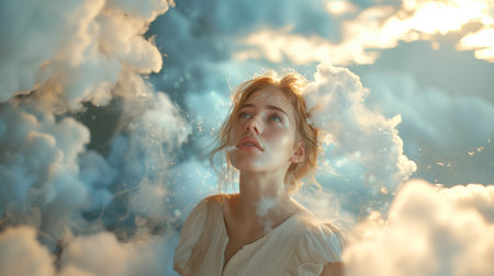 A woman with a dreamy expression is enveloped by fluffy clouds, creating a serene and ethereal atmosphere. The image conveys a sense of peace and wonder.