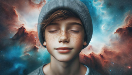 An AI generated illustration of A young boy with his eyes closed, wearing a hat, looking up at the sky