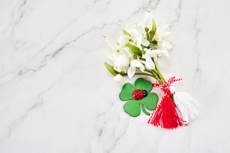 First of march celebration Martisor, Baba marta. Bouquet of snowdrops on white background with red and white rope and lalybug.
