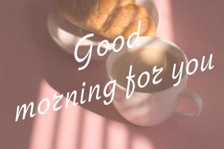 Cup of coffee with a croissant on a pastel pink background and the inscription Good morning in white letters.