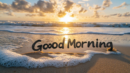 A stunning sunrise casts golden light over gentle waves lapping at sandy shores, accompanied by a cheerful Good Morning message, evoking serenity and optimism.
