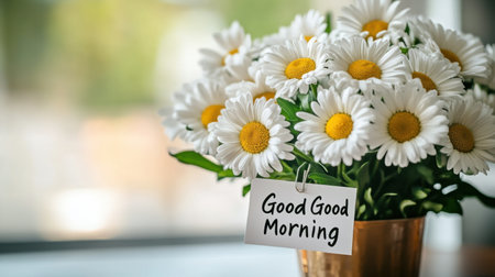 A beautiful arrangement of daisies in a vase with a heartfelt Good Morning greeting card, perfect for adding joy and brightness to any space.