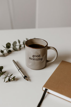 Good Morning! Cup of hot drink on table