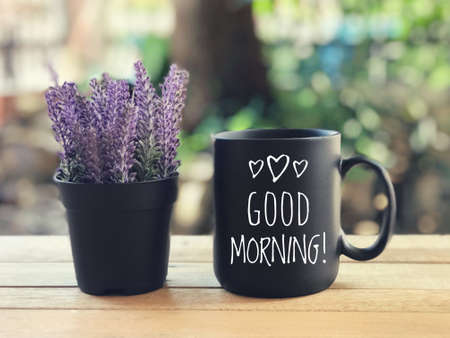 Motivational and inspirational wording - GOOD MORNING written on a black mug. Blurred styled background.