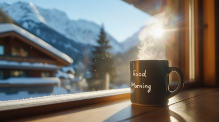 A warm cup of coffee with Good Morning text sits on a windowsill, overlooking a snowy mountain landscape. Steam rises from the mug.