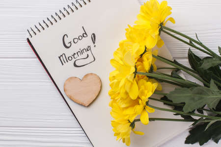 Yellow sunchoke flowers and good morning wish. White wood background.