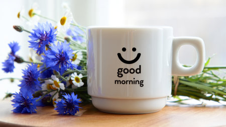 Good morning mug with flowers on wooden table. generated by ai