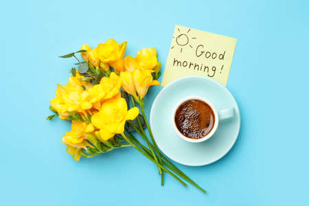 Cup of aromatic coffee, beautiful yellow freesias and Good Morning note on light blue background, flat lay