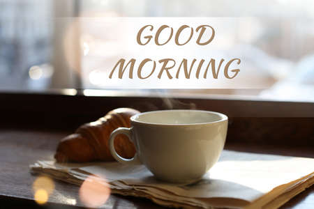 Good Morning! Delicious coffee, newspaper and croissant near window indoors