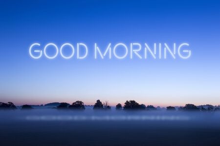 A misty field just before sunrise on a summers day. With the words good morning glowing above in the sky.