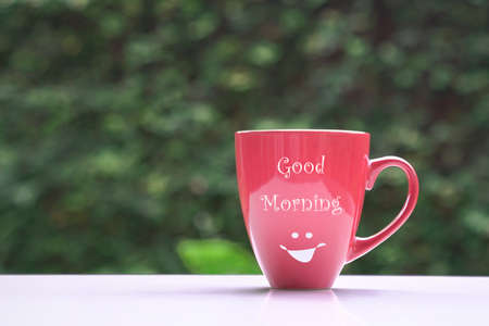 Good morning message on red coffee cup, on green nature background. Copy space.