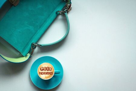 Female hand holding a blue cup with hot coffee or tea on a blue background. Added text Good morning. Breakfast concept with hot coffee.