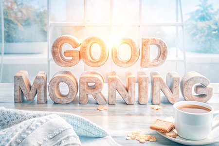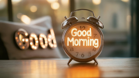 A charming vintage alarm clock displaying a bright Good Morning message, set against a cozy home environment with soft lighting, perfect for daily inspiration.