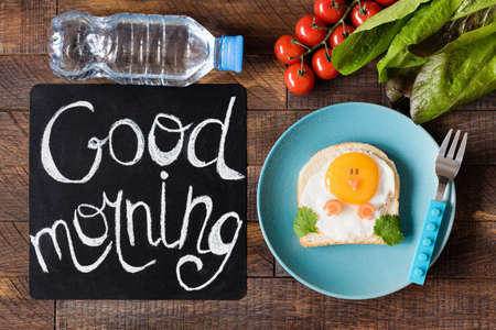Good Morning Breakfast For Kids. School Lunch Chicken Sandwich Creative Food Art Sandwich. Cute Funny Chicken Shaped Toast For Children. Good Morning Written On Chalkboard. Top view