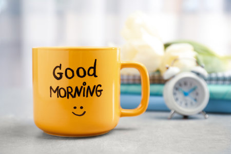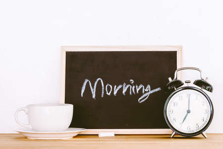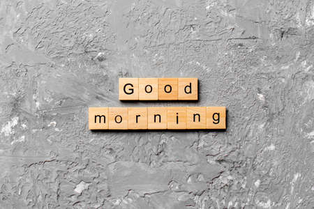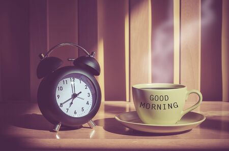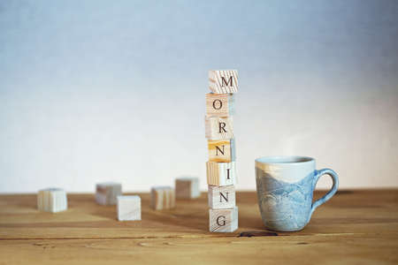 good morning cubic blocks with cup coffee wooden desk. High quality beautiful photo concept