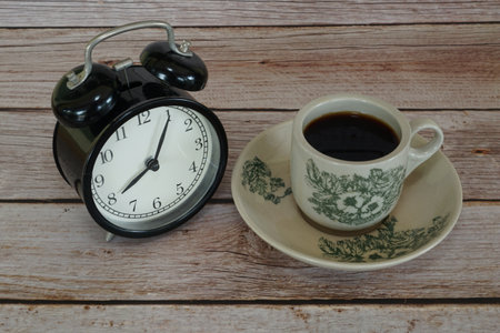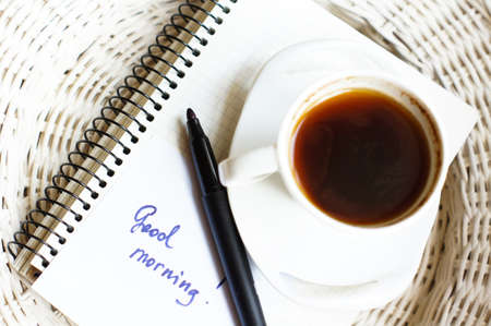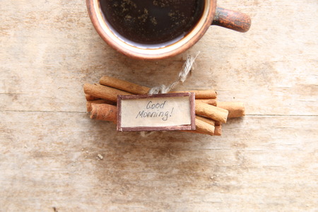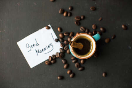 Coffee time, cup of black coffee and cinnamon and anise spices, Good morning note