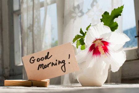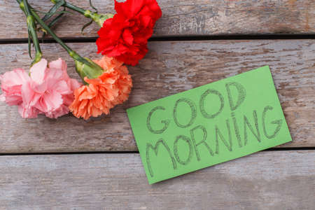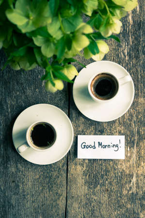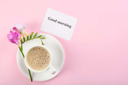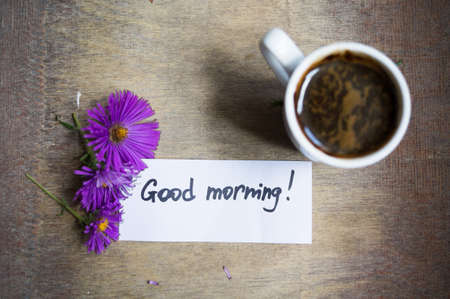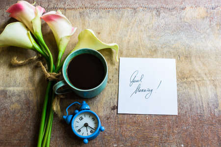 A cup of coffee, a bouquet of flowers and a card with the words good morning.