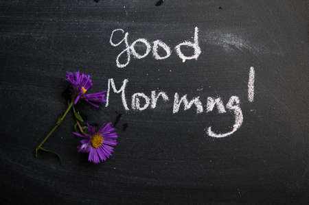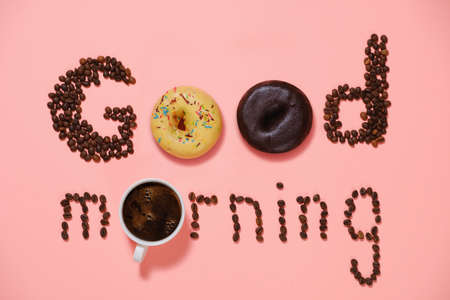 Morning composition of coffee and donut as a sun on chalkboard, inscription good morning written with chalk