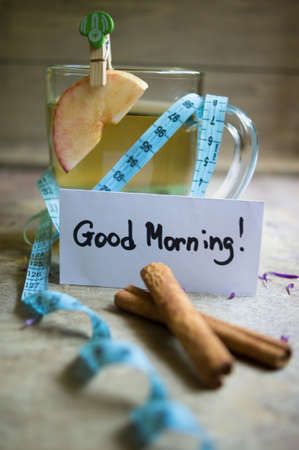 Leaf Notebook inscription good morning on purple table top. The cozy breakfast or Mother's Day. Copy space.