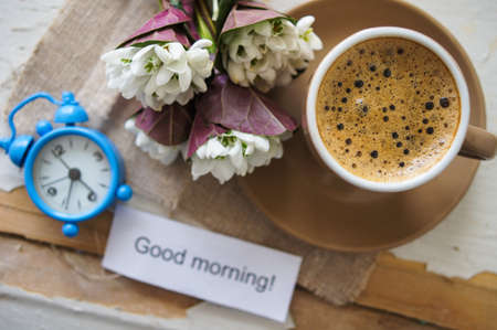Cup of black coffee and first spring snowdrop flowers on the old table