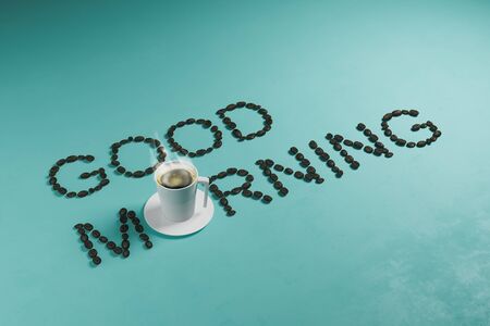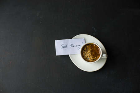 Composition with a cup of coffee and spoon and the inscription Good morning on a dark blue background