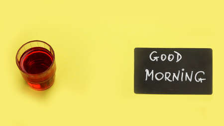 Text GOOD MORNING made of color letters and alarm clock on yellow background