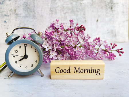 Good morning note, lilac flowers and old-styled clock on the wooden table