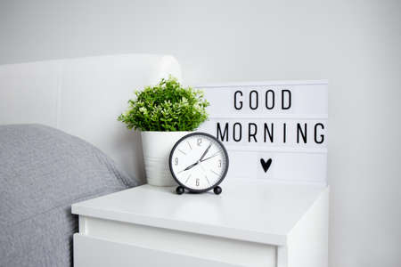 good morning concept - close up of alarm clock, houseplant and lightbox with good morning words on bedside table in bedroom