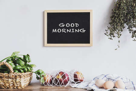 Stylish and coozy interior of kitchen space with small table with mock up frame, herbs, cup of coffee, eggs and vegetables. Vintage concept of kitchen space..