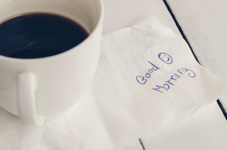 handwriting on a napkin with a cup of coffee and emoticon smiling face