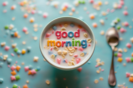Words made of colorful cereal. Good Morning message in a bowl. Simple and fast breakfast. National cereal day. Minimal creative food concept.