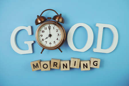 Yellow alarm clock with bell and Good Morning text from wooden cubes