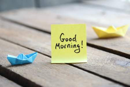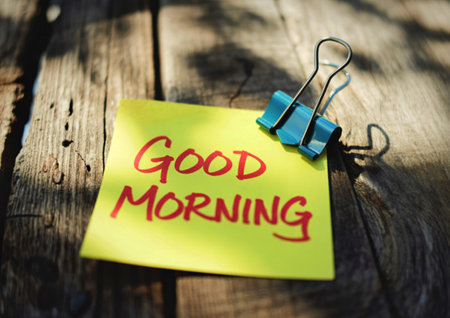 A cheerful yellow sticky note with 'Good Morning' written in red ink is secured by a vibrant blue binder clip. The note rests on weathered wooden planks, bathed in soft sunlight.