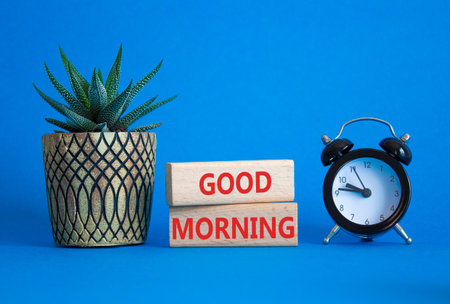 Good Morning symbol. Concept word Good Morning on wooden blocks. Beautiful blue background with alarm clock and succulent plant. Business and Good Morning concept. Copy space