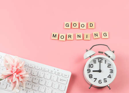 Top view or flat lay of white vintage alarm clock with bouquet of pink flower on computer keyboard and wooden letter GOOD MORNING on pink background.