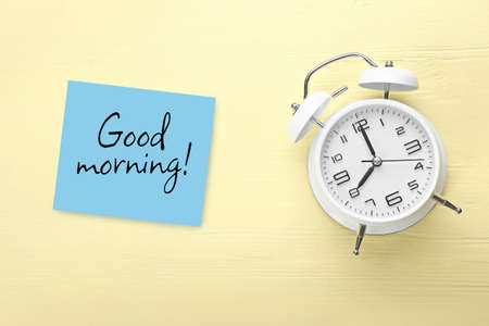 Alarm clock and paper with text GOOD MORNING on color wooden background, top view