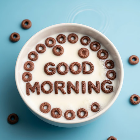 Good Morning Message with Chocolate Ring Cereal in a White Milk Bowl